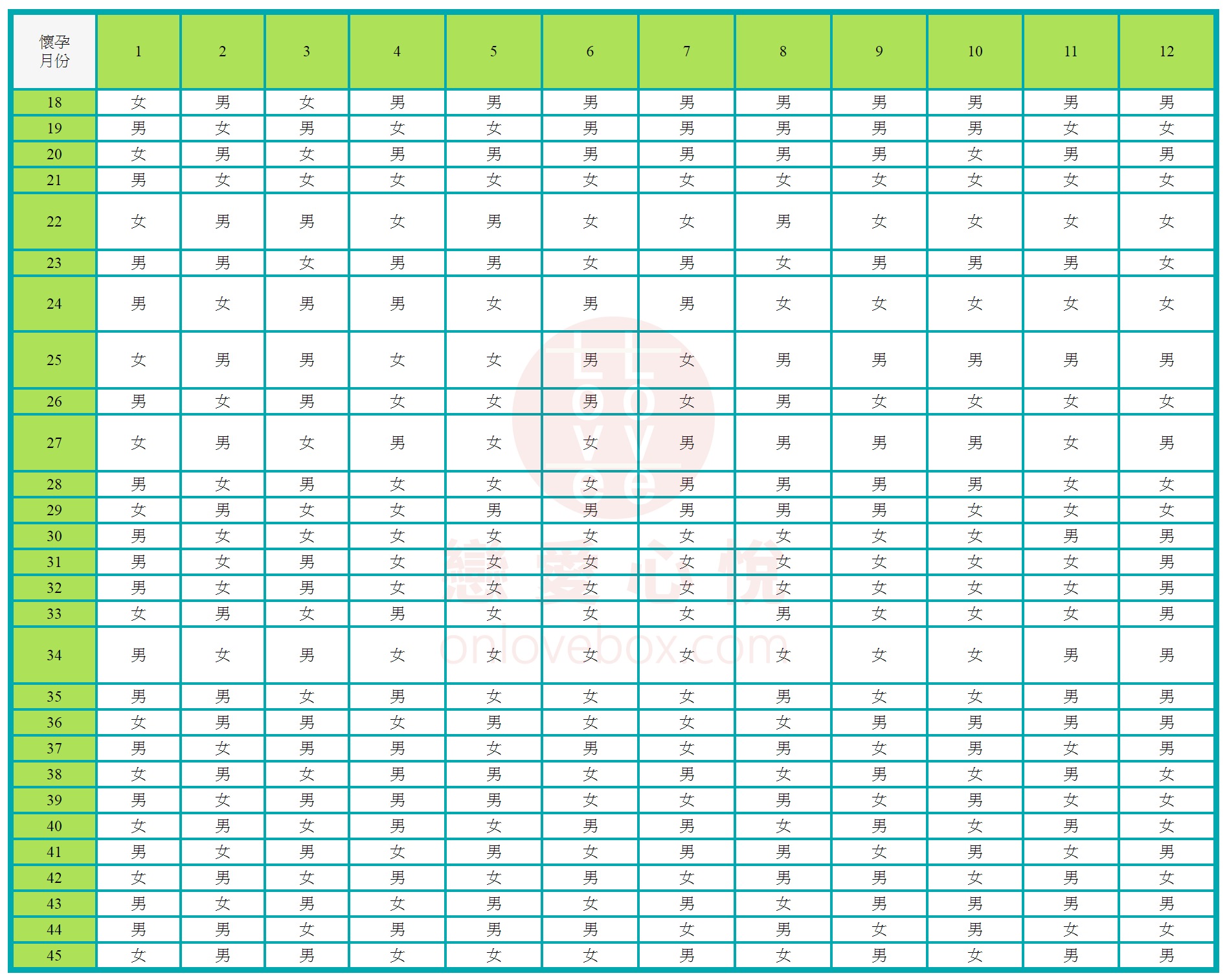 這張「生男育女預計表」是以女性為準以陰曆為主,圖中所示:橫的一至十二的數字是表示婦女懷孕月份,直的十八至四十五的數字是女性的虛歲年齡。其中的《男、女》是代表嬰兒的性別。如果一切調配得當,生男與生女就可隨心所欲了。